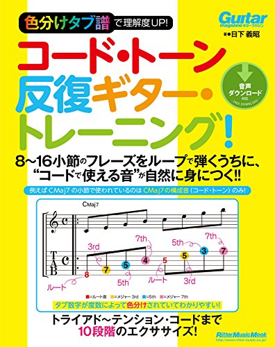 ギタリストがコードに合った音をポジションで覚えて身につけるための反復練習用フレーズ集です。コード・トーンを網羅するスウィープ奏法系のポジショニングを基本に、ルート音とコード・トーンの位置関係を体感的に習得できます。さらにタブ譜の数字をルート、3rd、7th などを色分けして表示している、従来にない「目で見てわかりやすいコード・トーン教本」です。本書を読めば、コード譜を見てすぐに使えるポジションを把握できるようになりますよ!
