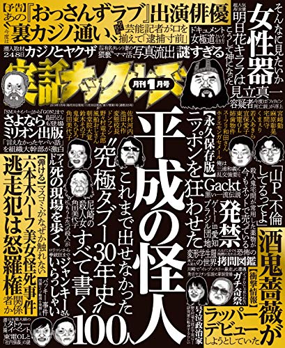 平成を揺るがした人物、事件の「これまで書けなかったこと」を一挙大公開する特集、「平成の怪人100人」。宮崎勤の連続殺人事件の捜査資料、酒鬼薔薇がラッパーデビューの怪情報、風船おじさんや姉歯物件のその後も追跡。さらにあの「おっさんずラブ」俳優の犯罪疑惑から超有名モデルの「ママ活ワイセツ写真」を緊急入手。好評シリーズ「ゲトーの国からこんにちは」は名古屋・豊田の通称”ブラジル団地”からうまれた人気クルーに密着取材。ワイドショーやネットでは絶対読めない”ニッポンの裏”が満載です!