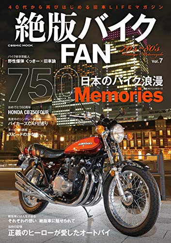 男をアゲる絶版車ライフスタイル宣言!大人気につき、Vol.7発刊! 昭和の絶版車をターゲットに「ヒト」「モノ」「バイク」を対象に様々な角度で、それぞれが楽しむライフスタイルを紹介。 10人の絶版車乗りが居れば、その楽しみ方、使っているもの、保管している場所、スタイル等、十人十色。鋭い視点から本当にオーナー達が見たい情報・記事を提供します。 憧れの名車を手に入れてからのライフスタイルの広がりを見せる、かっこいいバイクオヤジのスタイルマガジン、それが「絶版バイクFAN」です。 <巻頭企画>日本のバイク浪漫 国産ナナハンメモリーズ <特集>おめでとう50周年 HONDA DREAM CB750 FOUR <オーナーズギャラリー>Z400FX、CB750Four K0 など <特別インタビュー>思わず惚れた…アレ!! くっきー✕SUZUKI GT380(野性爆弾) <イベントレポート>ミスティプレゼンツ オーナー集会 KAWASAKI Z400FX ゲリラミーティング Tokyo Motor Cycle Show 2019 <連載企画>第三京浜のシンデレラtour/ぶらりバイカーズCAFEめぐり <バイク愛に溢れた企画・記事多数掲載!> ホンダ CB750 K0 砂型 マニアック 絶版ウエマツ ツーリング女子会 往年の絶版レア車 from ウエマツ バイカーファッション・カドヤ、川口シート、昭和ヴィンテージ、下単屋 etc… などなど
