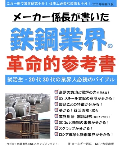 鉄鋼業界に就職を考えている学生や、既に業界にいる経験のまだ浅い若手社員の方々、中途採用で業界の知識に不安を持たれている方々等の頼れるバイブルの様な業界参考書になっています。