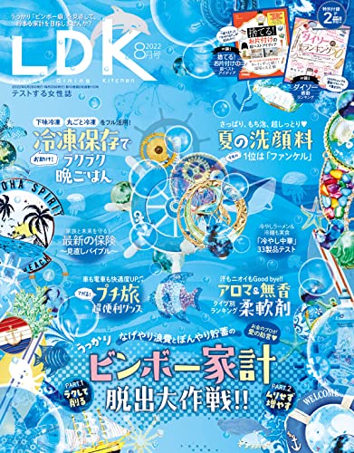 『LDK8月号』総力特集は、「なげやり浪費とぼんやり貯蓄の うっかりビンボー家計脱出大作戦」。ほかにも、「プチプラ洗顔料ベストランキング2022」、「冷凍保存で忙しい日のラクラクごはん作り」、「旅心をくすぐりまくり♪ 女性のためのトラベルグッズ」、「夏の快眠ベストアイディア」など、盛りだくさんです!!